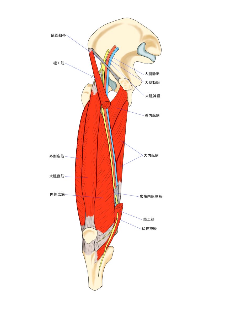 伏在神経は太ももの内側から膝の内側、さらにすねの内側へと伸びる感覚神経です。この神経は主に皮膚の感覚を司っており、運動機能には関与しません。そのため、障害が起きると筋力低下ではなく、痛みやしびれといった感覚異常として現れます。膝の内側に症状が出やすいのは、この神経の走行が関係しています。